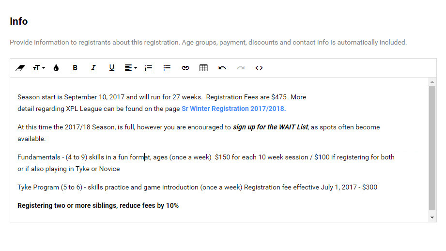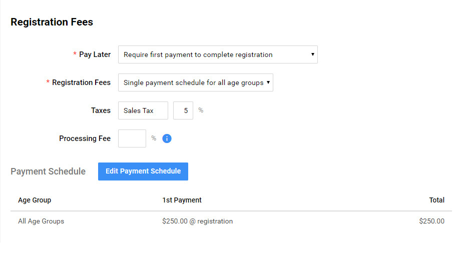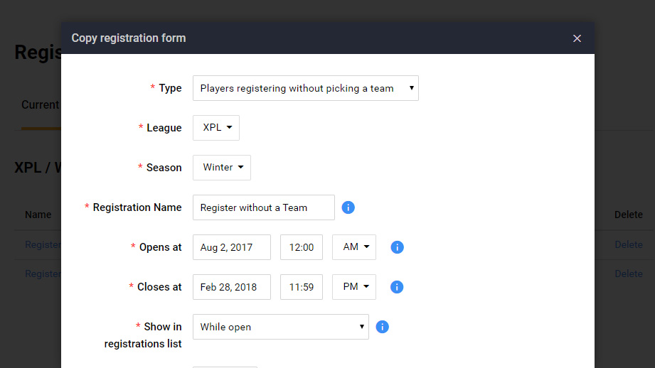 Configure your registration with options like type, stats options, open and close dates and payment options.