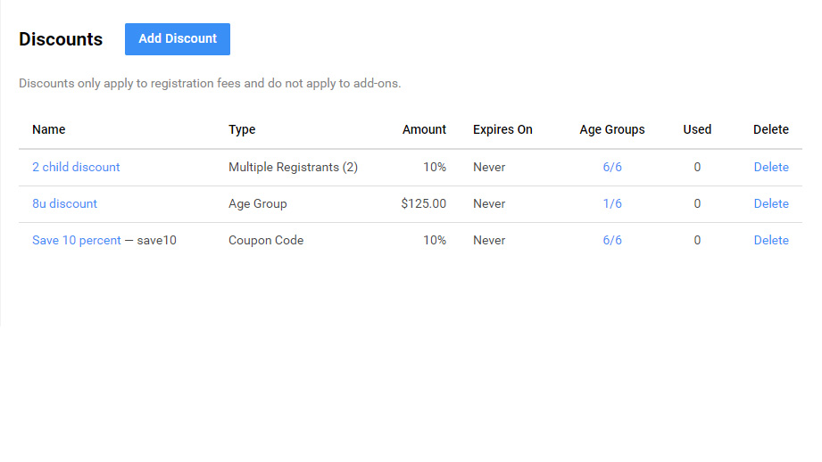 Add discounts to registration fees such as: coupon codes, early bird, age groups and family discounts.