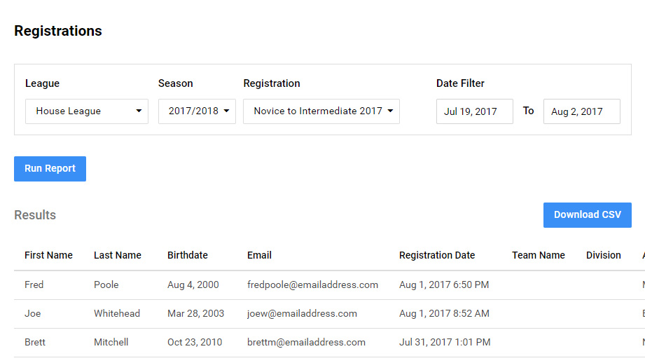 Generate registration reports and then download them in a .csv spreadsheet format.