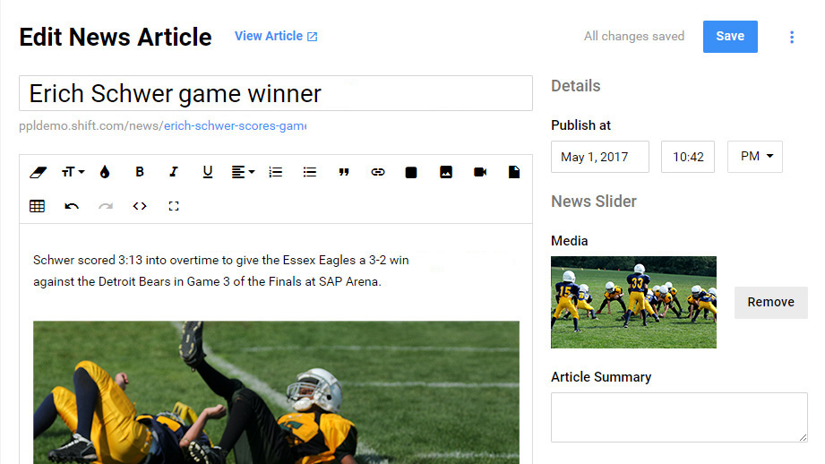 Post news articles with ease. Enhance your article with a featured photo or video.